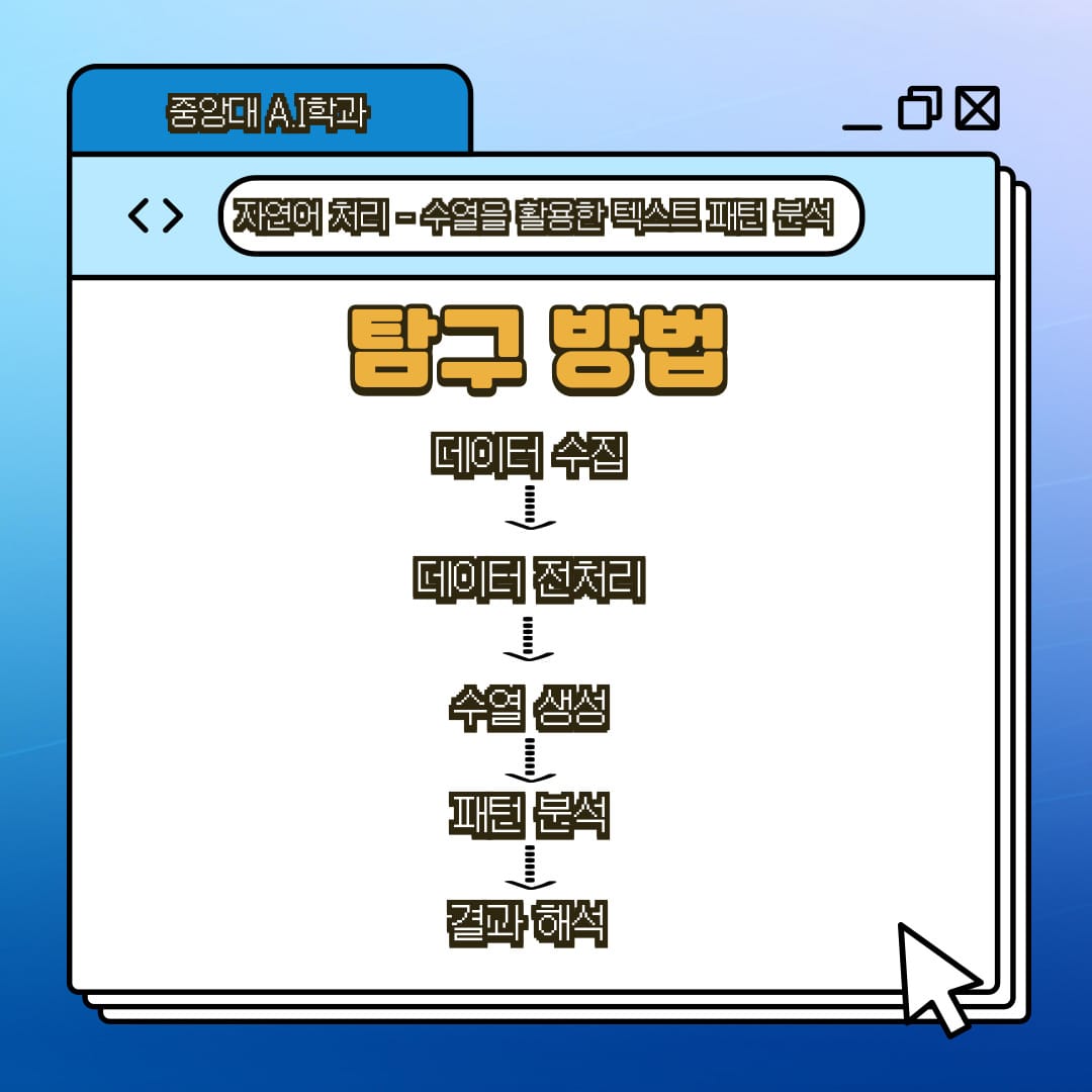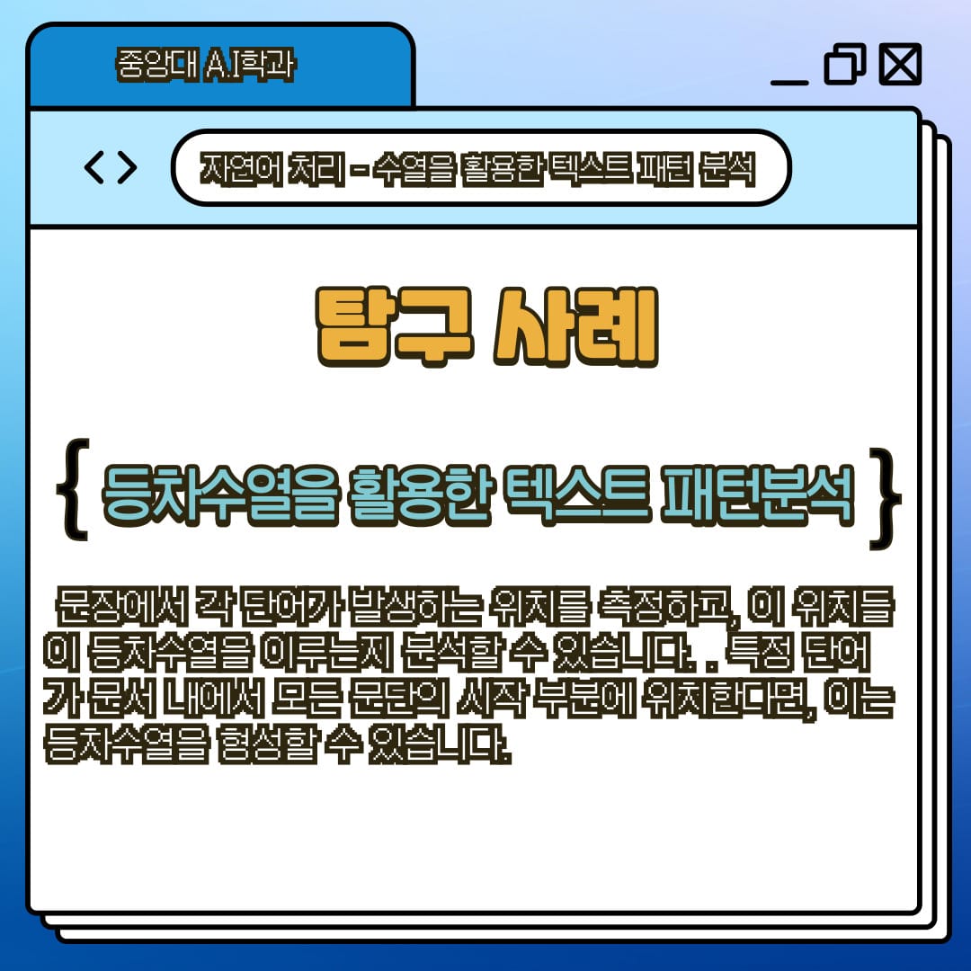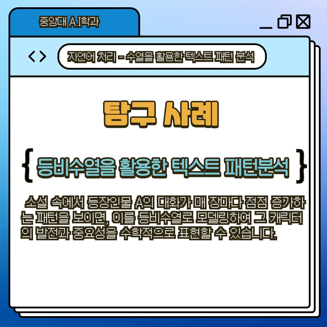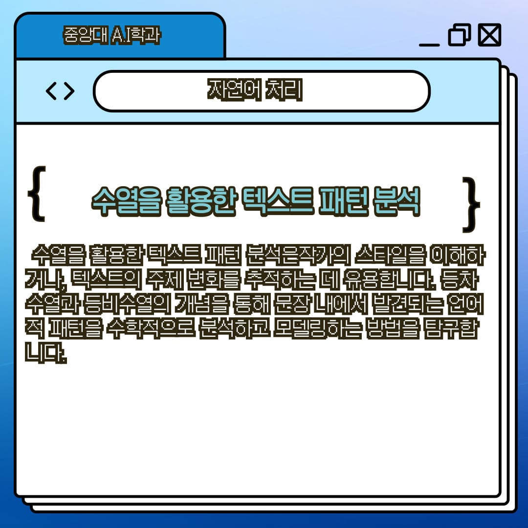 중앙대학교 A.I학과를 희망하고 "자연어 처리"에 관심이 많은 학생들을 위해 수학 1의 개념을 자연어 처리(Natural Language Processing, NLP)에 적용하여 탐구 주제를 추천하고, 추천 주제 중 “수열을 활용한 텍스트 패턴 분석”을 선정해 탐구 방법을 소개 합니다. ❗️❗️❗️