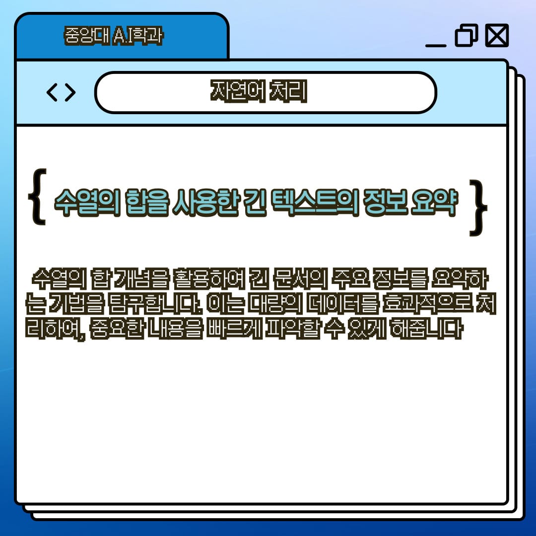 수열의 합 개념을 활용하여 긴 문서의 주요 정보를 요약하는 기법을 탐구합니다. 이는 대량의 데이터를 효과적으로 처리하여, 중요한 내용을 빠르게 파악할 수 있게 해줍니다.