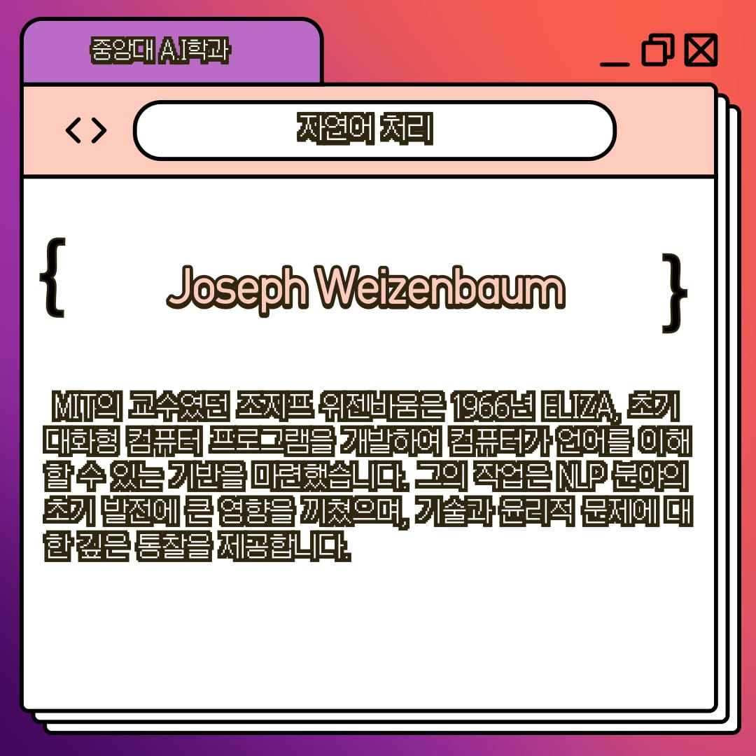 MIT의 교수였던 조지프 위젠바움은 1966년 ELIZA, 초기 대화형 컴퓨터 프로그램을 개발하여 컴퓨터가 언어를 이해할 수 있는 기반을 마련했습니다. 그의 작업은 NLP 분야의 초기 발전에 큰 영향을 끼쳤으며, 기술과 윤리적 문제에 대한 깊은 통찰을 제공합니다.