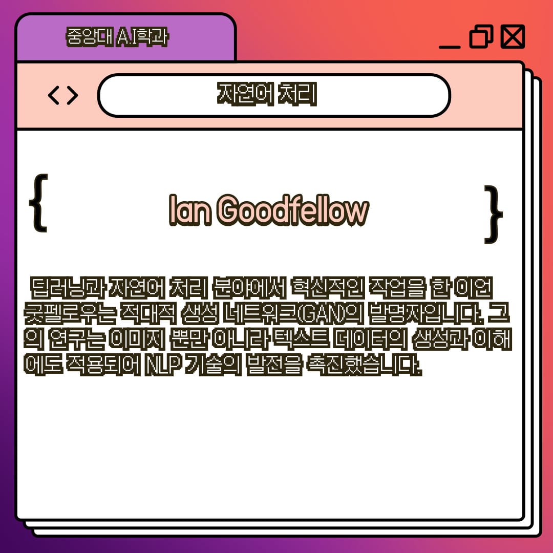 딥러닝과 자연어 처리 분야에서 혁신적인 작업을 한 이언 굿펠로우는 적대적 생성 네트워크(GAN)의 발명자입니다. 그의 연구는 이미지 뿐만 아니라 텍스트 데이터의 생성과 이해에도 적용되어 NLP 기술의 발전을 촉진했습니다.