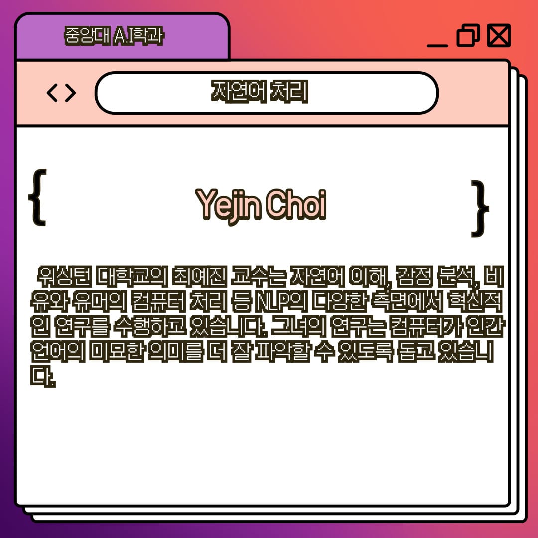 워싱턴 대학교의 최예진 교수는 자연어 이해, 감정 분석, 비유와 유머의 컴퓨터 처리 등 NLP의 다양한 측면에서 혁신적인 연구를 수행하고 있습니다. 그녀의 연구는 컴퓨터가 인간 언어의 미묘한 의미를 더 잘 파악할 수 있도록 돕고 있습니다.