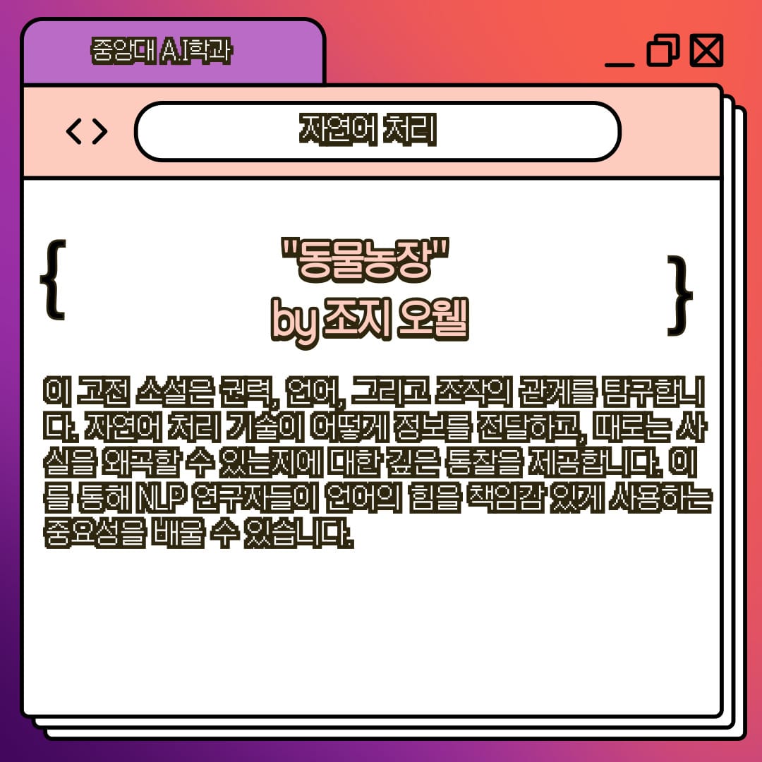 이 고전 소설은 권력, 언어, 그리고 조작의 관계를 탐구합니다. 자연어 처리 기술이 어떻게 정보를 전달하고, 때로는 사실을 왜곡할 수 있는지에 대한 깊은 통찰을 제공합니다. 이를 통해 NLP 연구자들이 언어의 힘을 책임감 있게 사용하는 중요성을 배울 수 있습니다.