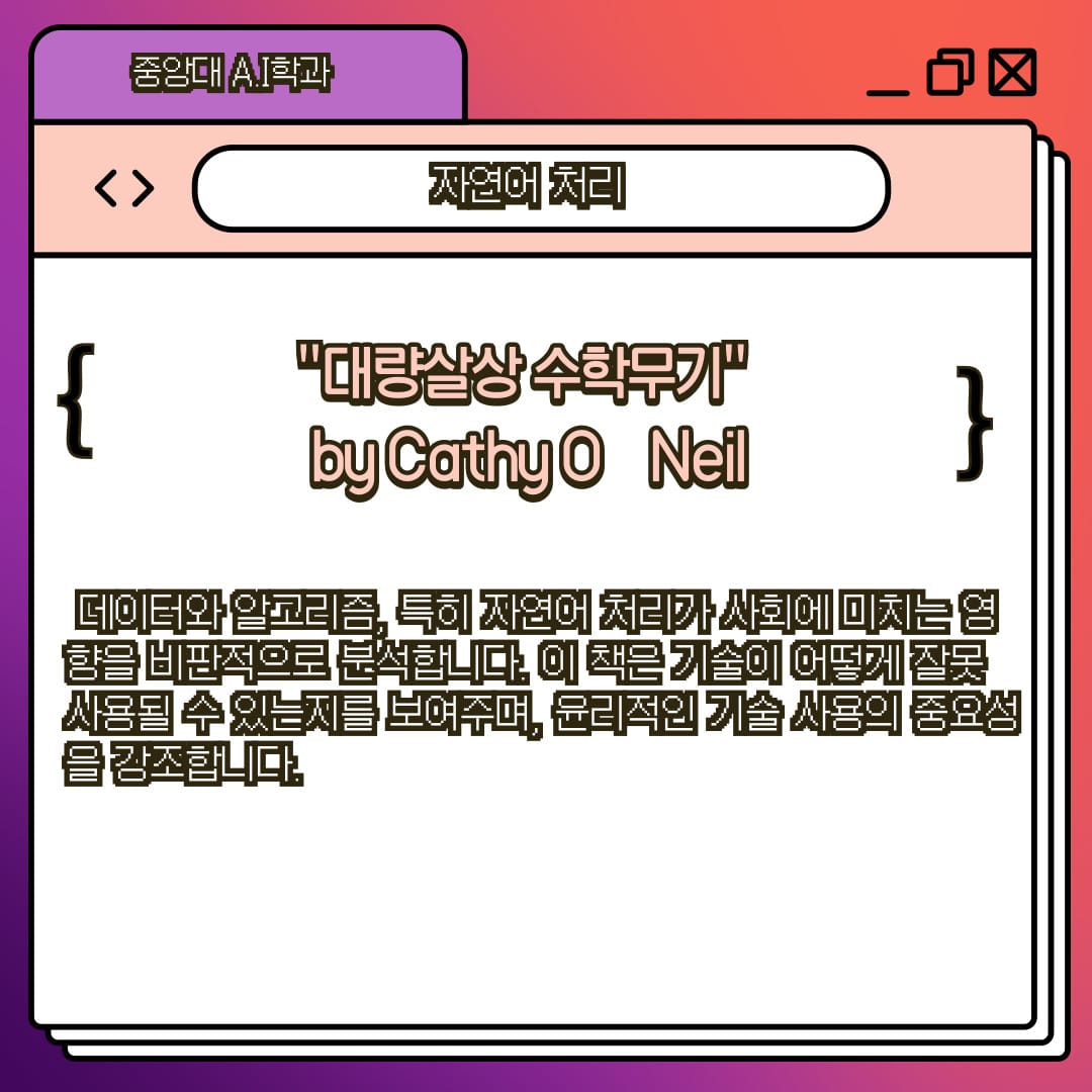 데이터와 알고리즘, 특히 자연어 처리가 사회에 미치는 영향을 비판적으로 분석합니다. 이 책은 기술이 어떻게 잘못 사용될 수 있는지를 보여주며, 윤리적인 기술 사용의 중요성을 강조합니다.