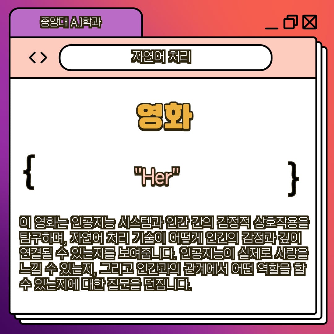 이 영화는 인공지능 시스템과 인간 간의 감정적 상호작용을 탐구하며, 자연어 처리 기술이 어떻게 인간의 감정과 깊이 연결될 수 있는지를 보여줍니다. 인공지능이 실제로 사랑을 느낄 수 있는지, 그리고 인간과의 관계에서 어떤 역할을 할 수 있는 지에 대한 질문을 던집니다.
