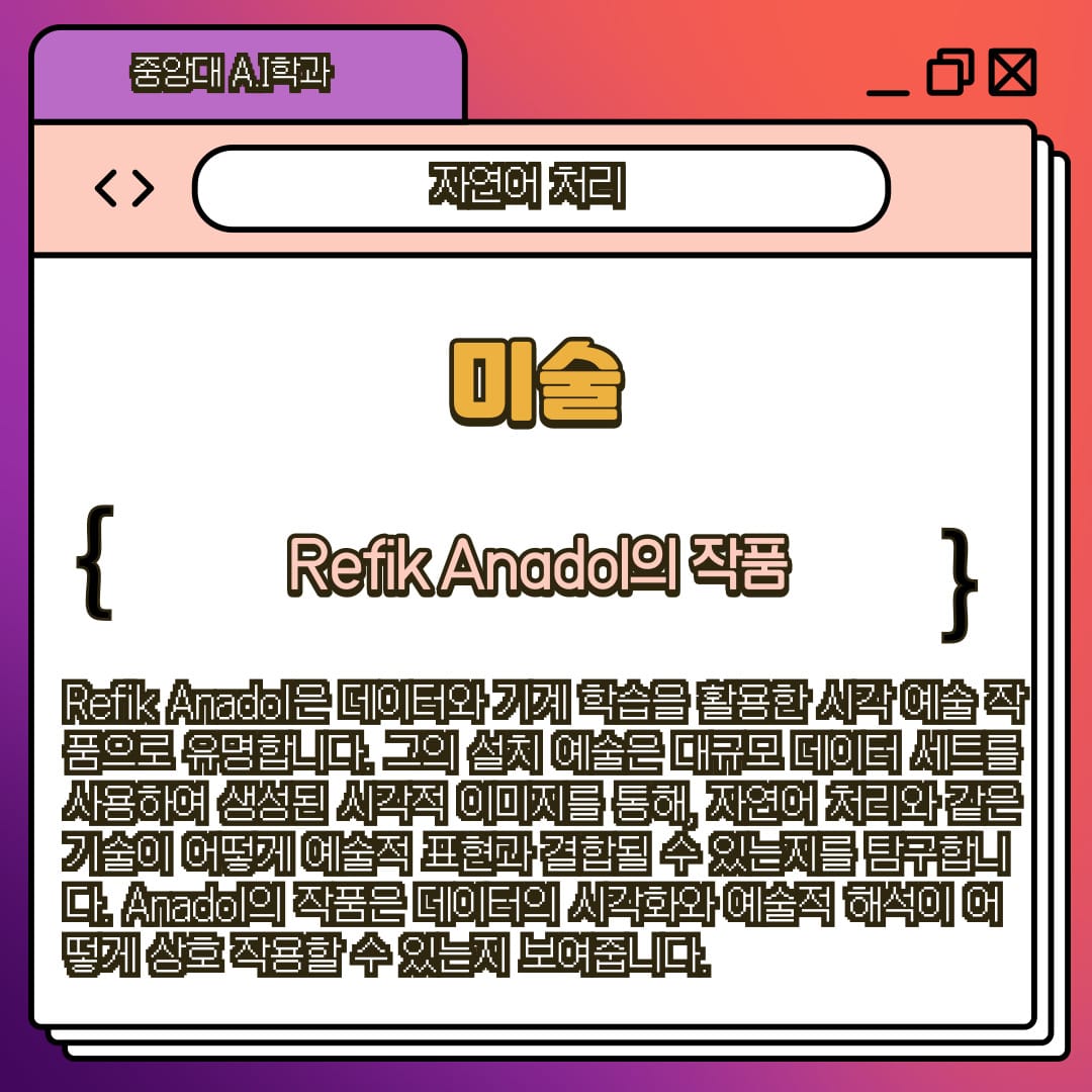 Refik Anadol은 데이터와 기계 학습을 활용한 시각 예술 작품으로 유명합니다. 그의 설치 예술은 대규모 데이터 세트를 사용하여 생성된 시각적 이미지를 통해, 자연어 처리와 같은 기술이 어떻게 예술적 표현과 결합될 수 있는지를 탐구합니다. Anadol의 작품은 데이터의 시각화와 예술적 해석이 어떻게 상호 작용할 수 있는지 보여줍니다.
