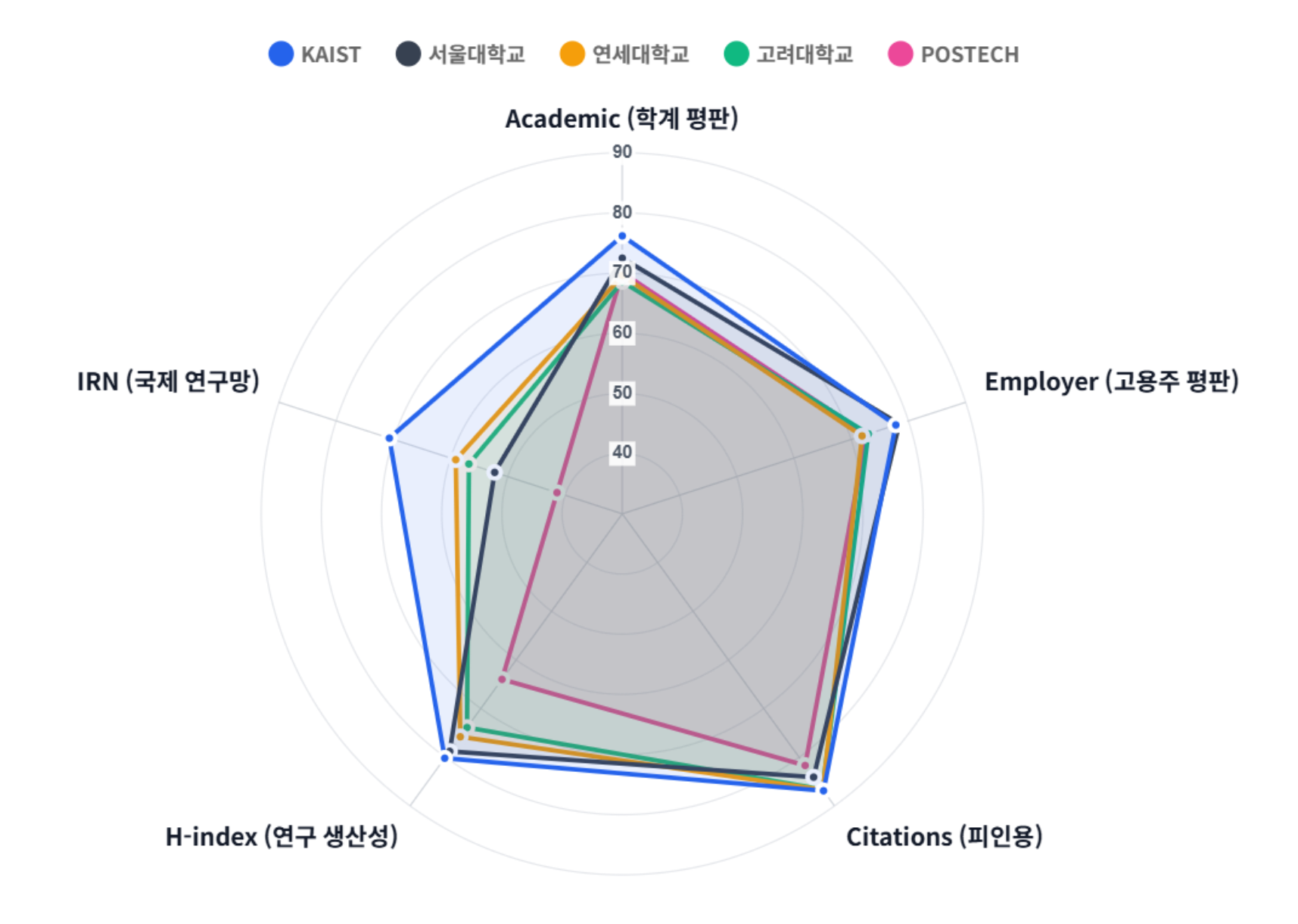 각 대학의 성과는 그 점수를 이루는 지표들이 어떤 형태로 배열되는지에서 더 분명하게 드러납니다. 이번 평가에 사용된 지표는 학계 평판(Academic), 고용주 평판(Employer), 논문 피인용(Citations), 연구 영향력(H-index), 국제 연구망(IRN) 다섯 가지입니다. 각 지표는 대학이 어디에 힘을 싣고 있는지, 어떤 방식으로 성과를 만들어왔는지를 읽어내는 기준이 됩니다.