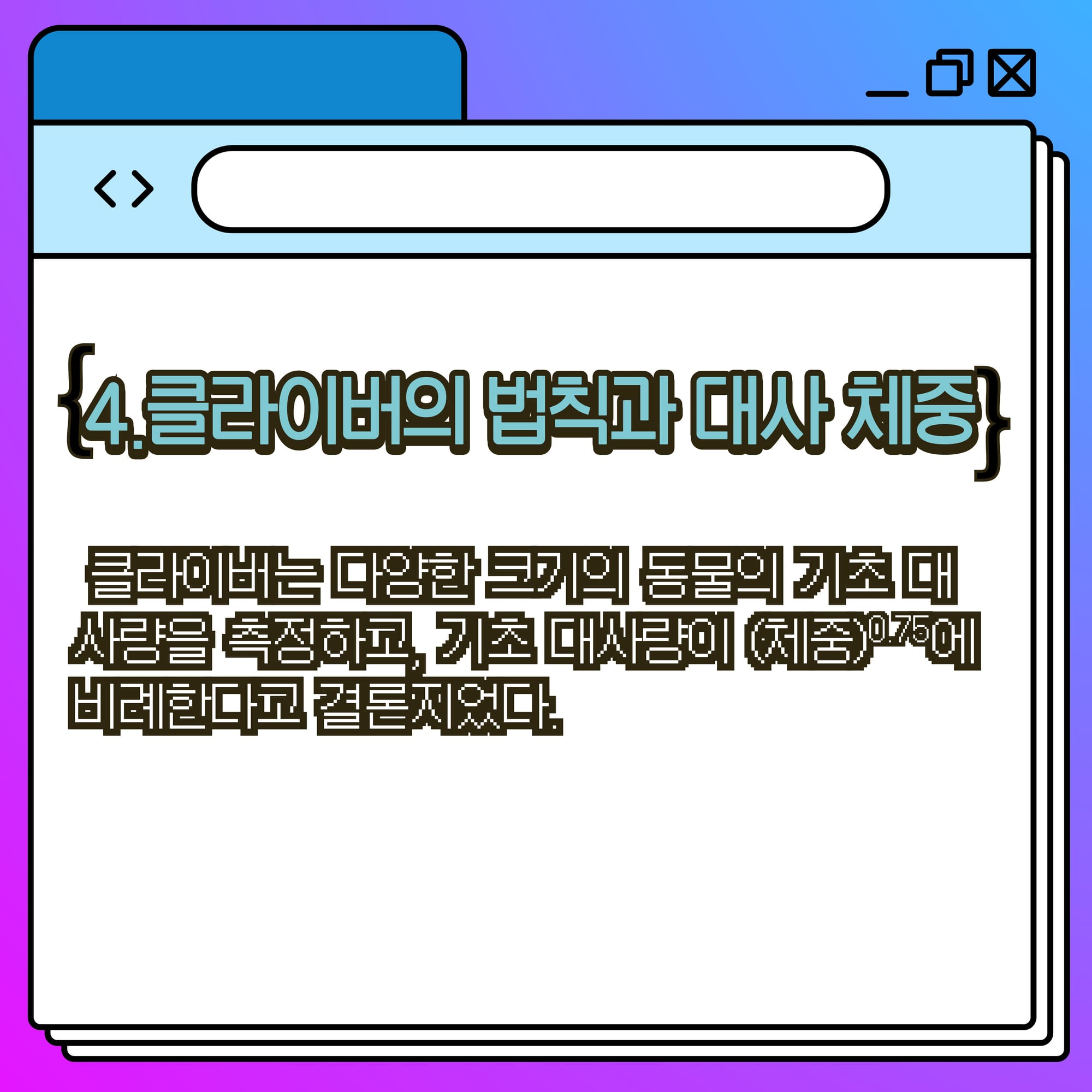클라이버는 다양한 크기의 동물의 기초 대사량을 측정하고, 기초 대사량이 (체중)0.75에 비례한다고 결론지었다.