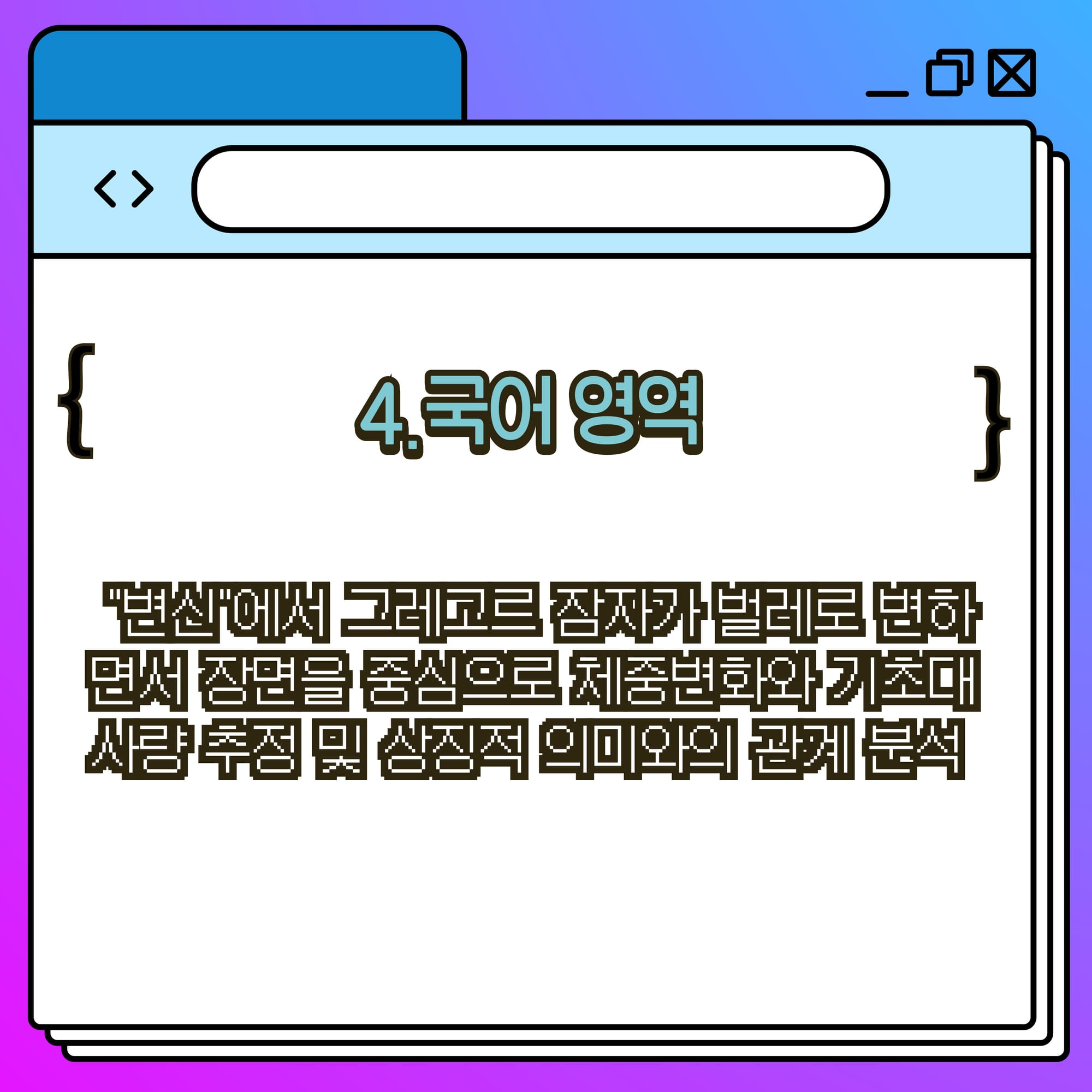 - 소설 발췌 : "변신"의 주요 장면을 읽고, 그레고르 잠자의 체중 변화와 관련된 부분 발췌합니다.